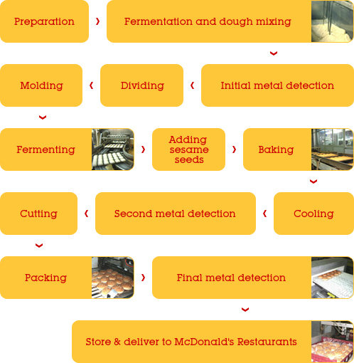 • Ingredients are mixed by fully automatic machines. Hands-free operations help ensure that our stringent food safety and quality standards are adhered to.
