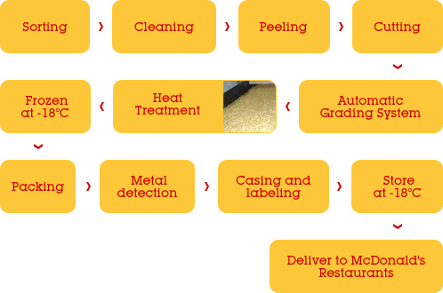 At McDonald’s our potato products are made from top-quality potatoes. Whole potatoes are used and each fry is specially produced for length, texture and color quality, to ensure quality and retain nutrients.
